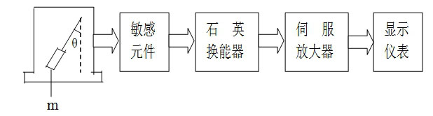 主要采用進(jìn)口石英撓性伺服加速度計(jì)為敏感元件,它是一個(gè)力平衡式的伺服系統(tǒng),當(dāng)傳感器相對(duì)于地球重心方向產(chǎn)生傾角θ時(shí),由于重力作用,傳感器中敏感元件相對(duì)于鉛錘方向擺動(dòng)一個(gè)角度,通過(guò)高靈敏的石英換能器將此角度轉(zhuǎn)換成信號(hào),經(jīng)過(guò)數(shù)據(jù)分析處理,可以直接用讀數(shù)儀顯示被測(cè)點(diǎn)的水平位移量。敏感元件是由接近零溫度系數(shù)的熔融石英玻璃制成,具有精度高,穩(wěn)定性好,重復(fù)性高,漂移小,熱穩(wěn)定性高等優(yōu)點(diǎn)。原來(lái)主要用于航天器上導(dǎo)航,近些年由于成本下降,用于測(cè)斜儀,按軍工生產(chǎn)標(biāo)準(zhǔn)生產(chǎn),可靠性高。儀器原理框圖見(jiàn)(圖一)。